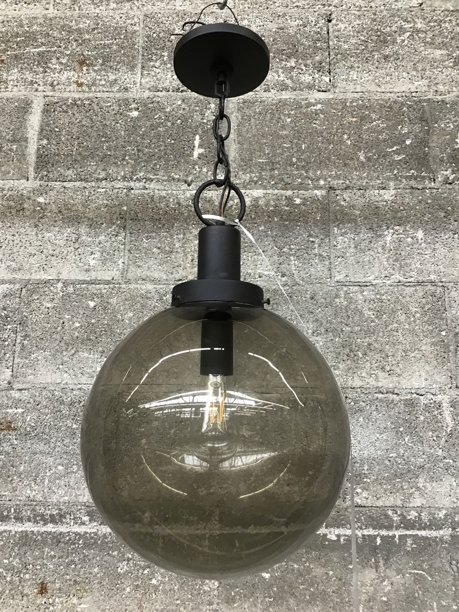 Stylish 1970s pendant light with a smoke glass globe suspended from a matte black fitter. Made by the L&S Lighting Fixture Co. out of Los Angeles. The wiring looks like it was redone somewhat recently and the fixture itself is in excellent condition.