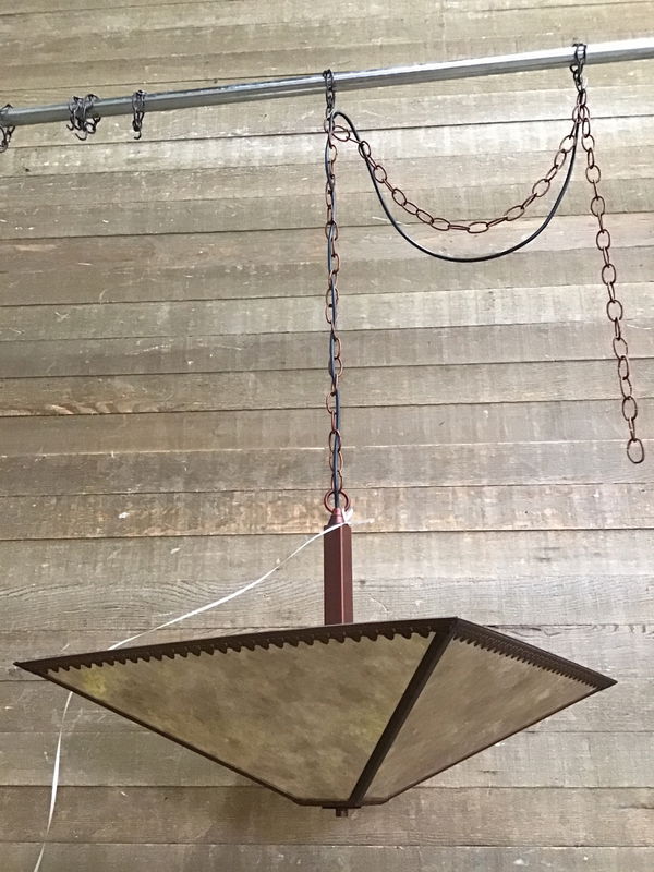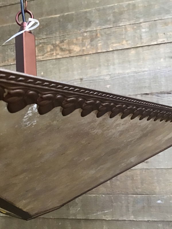 Cool pendant light fixture with a red metallic finish and tan toned panels. There are ivy leaves around the top edge of the light. The panels seem to be made of a laminate/man-made material. Height does not include roughly 51" of chain. This light will need a new canopy and mounting bracket.