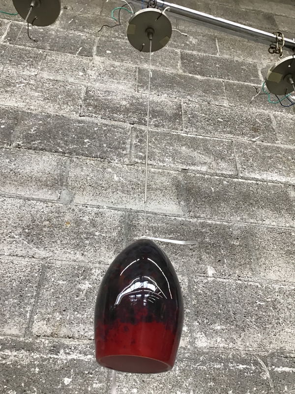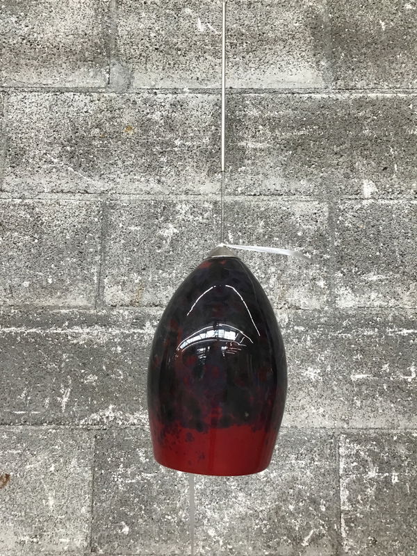 A simple pendant light fixture with a red and black glass shade. Includes a little 75 watt transformer.
