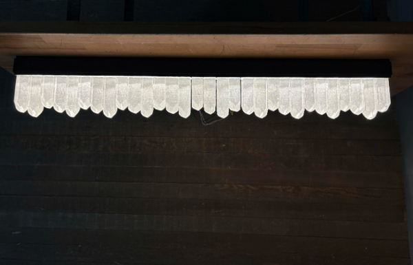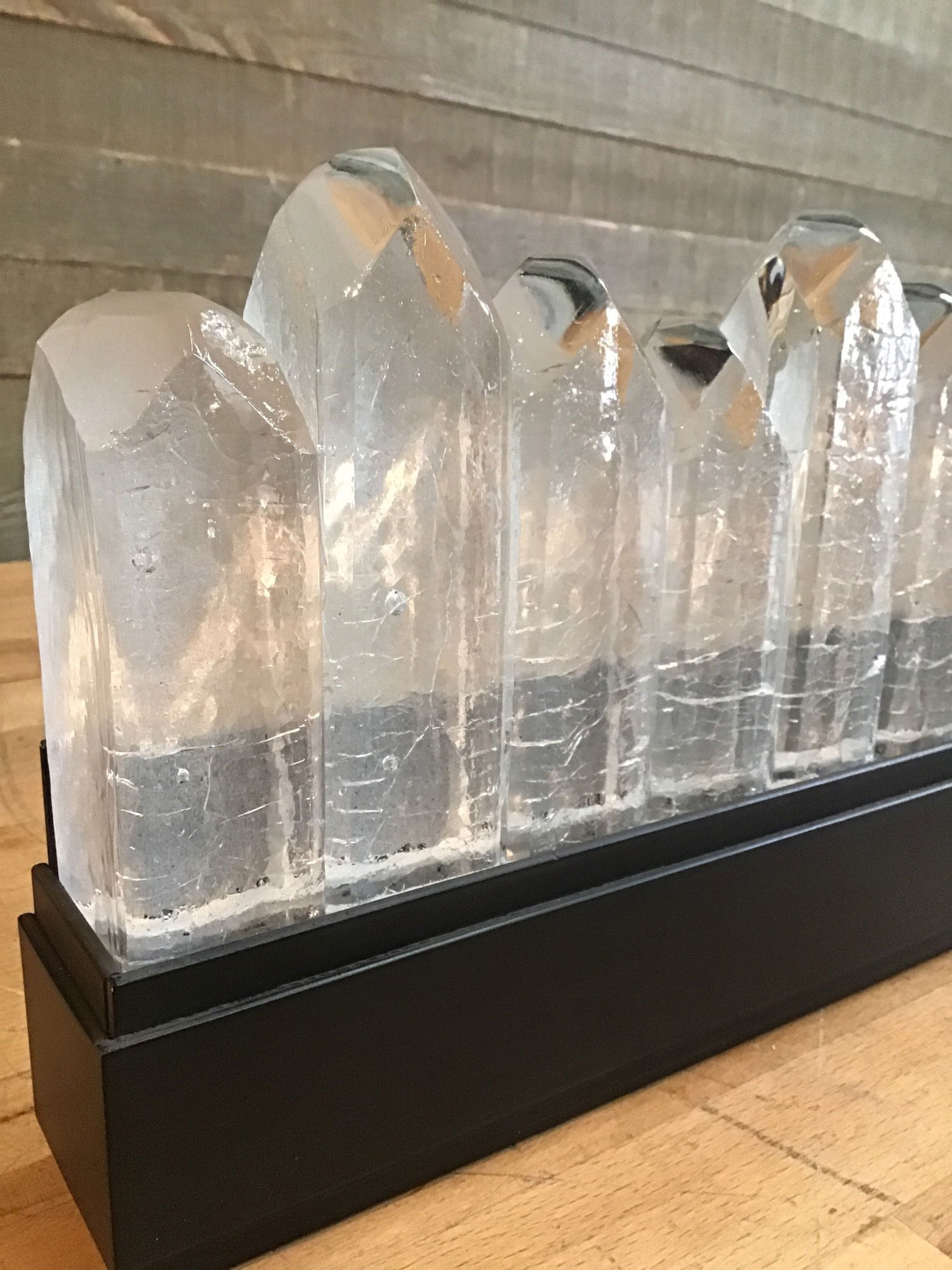 This LED bathroom vanity fixture"Lior", is truly one of a kind! Made by Fine Art Handcrafted Lighting. The glass spires are made to mimic natural crystal formations and set into a modern fixture with a sleek black finish! I could see this fixture being right at home in a cave-like bathroom aesthetic with natural stone and the shower looking like it was cut right out of a mountainside.