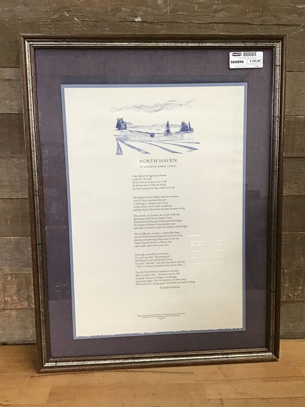 Signed and numbered print of the Elizabeth Bishop Poem "North Haven In Memoriam: Robert Lowell" in a wood frame. This print is collectible and lists for high prices.