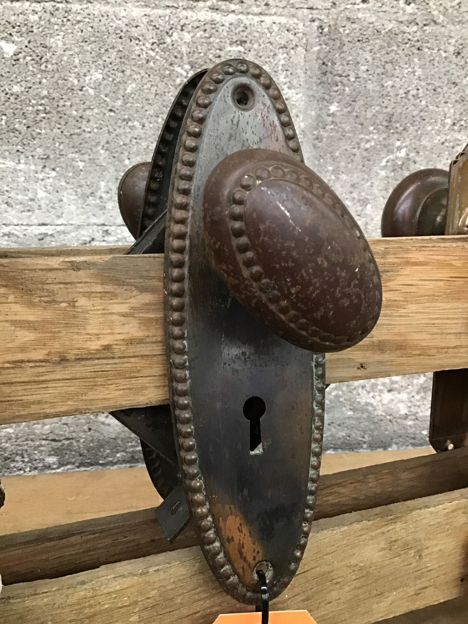 Vintage steel knobset with a beaded border pattern. Comes with spindle, set screws, functional mortise and matching escutcheons. There's a little bit of white paint on the mortise, but it shouldn't be hard to clean up.