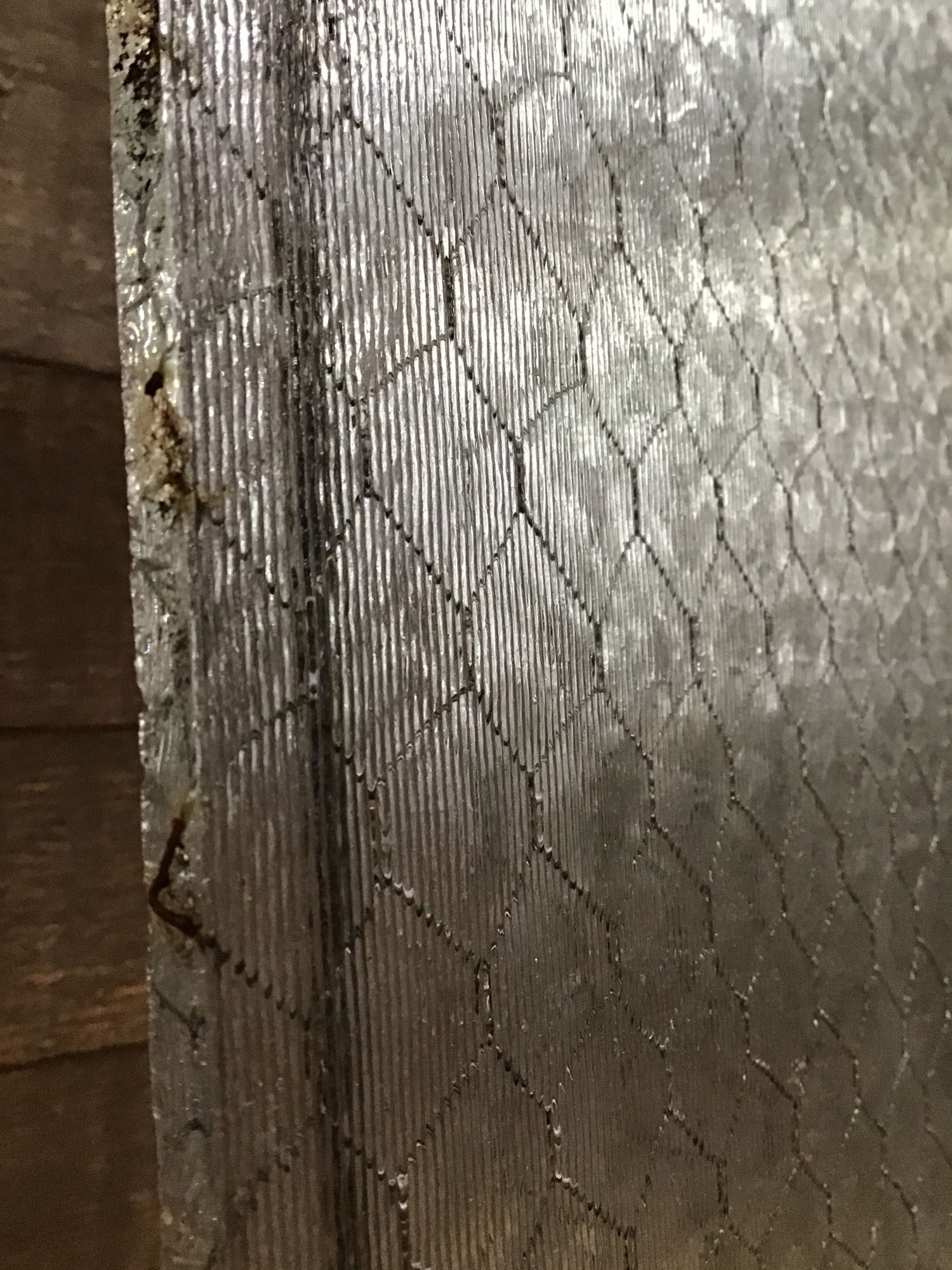 A nicely sized pane of reclaimed chicken wire fluted glass. Unfortunately a corner has a crack in it though the chicken wire is keeping that piece attached solidly. It is possible to cut this kind of glass which would leave you with a 33x20" rectangular pane. Not many people if any make this material anymore so it is rare, very cool!