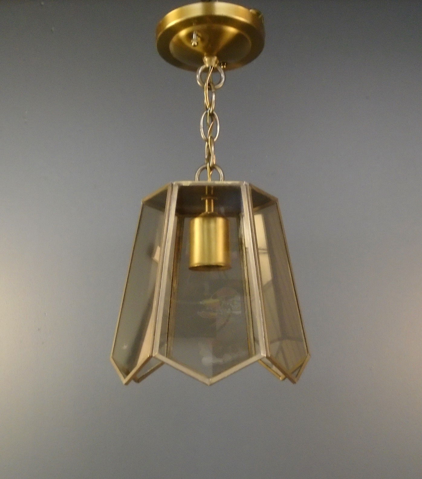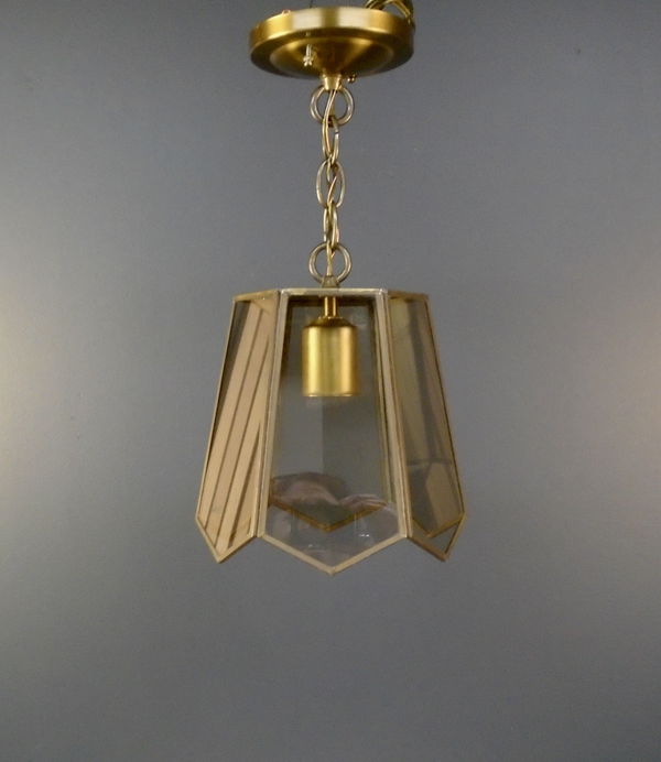 A cool pendant light made by ELA Co in 1980. The finish is an antique brass and it has 6 smoke glass panels. Restored in our on site light repair workshop