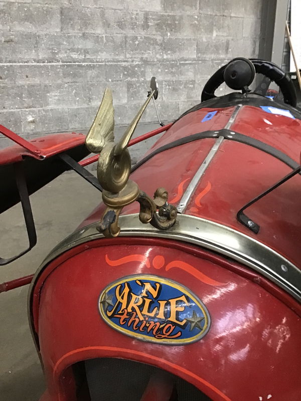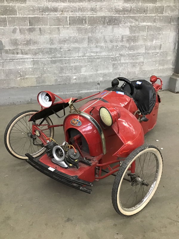 Amazing, bespoke, Red Bike Car that appears to have a custom, sculptural housing crafted around a three wheeled bike. My guess is that at some point it actually functioned but now needs some major structural TLC to get back to racing shape. The tires are flat and its internal gear situation is questionable, BUT it is still a fantastical thing of beauty with its red paint and custom pinstriping, it will be a labor of whimsical love to restore this!