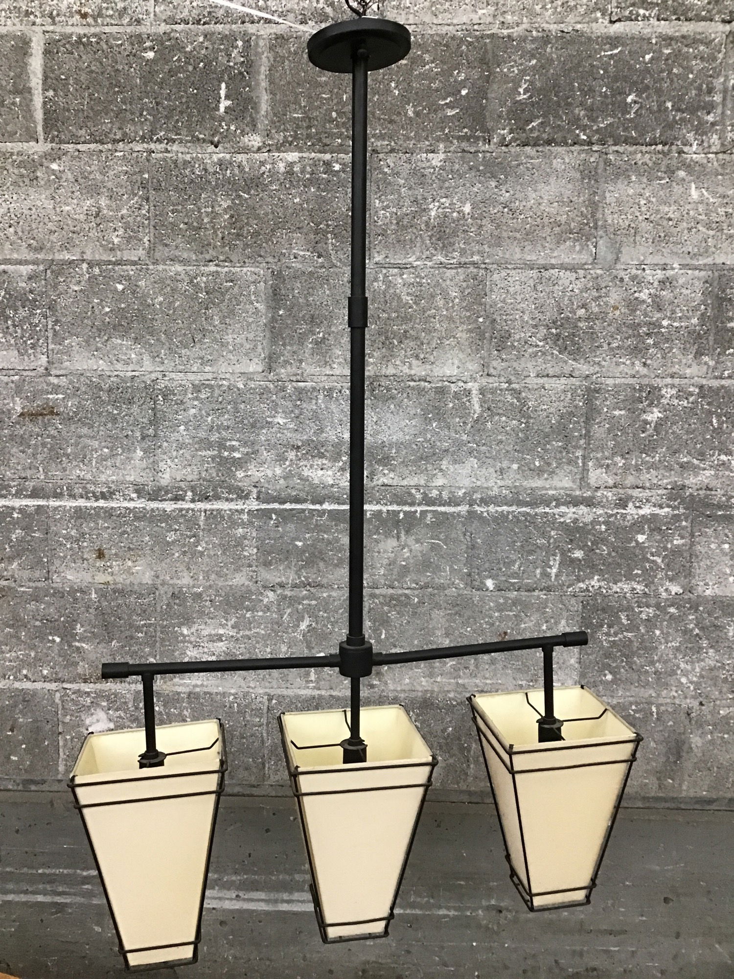 Interesting modern light with three shades, looks like it would thrive above a dining table.
