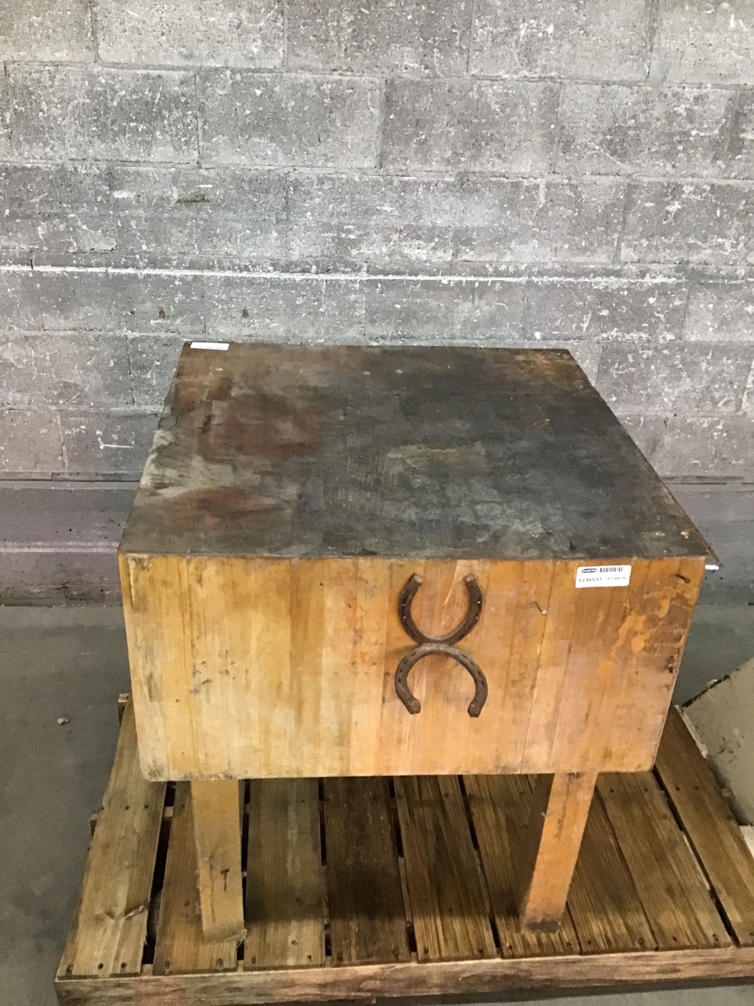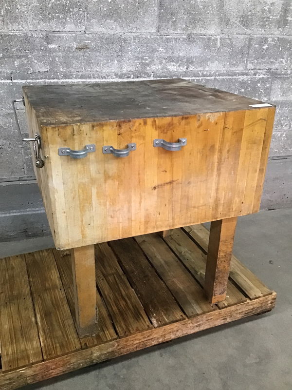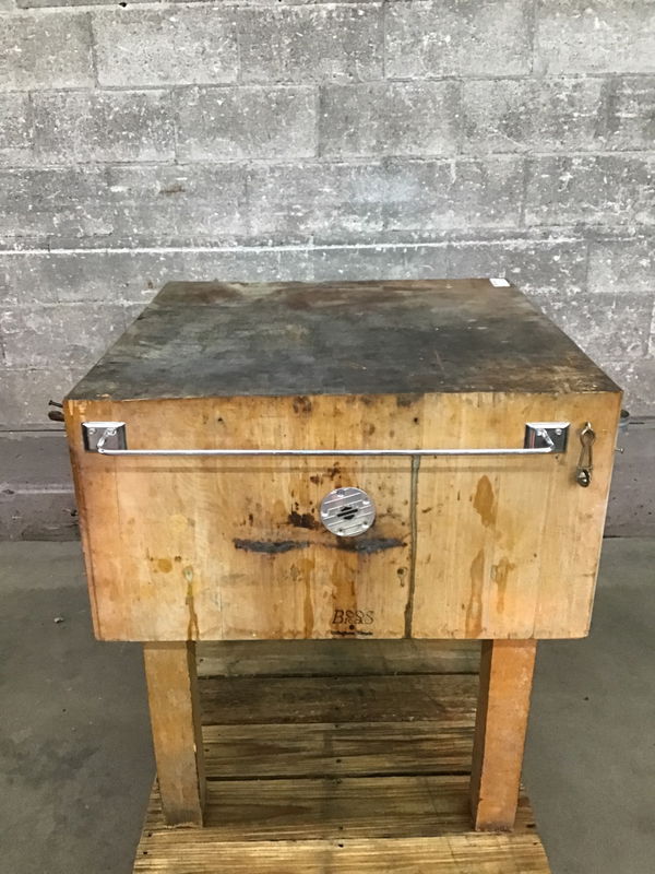 A handsome maple butcher block by Boos Block. Appears well loved judging from the pitting up top, but also the horseshoe and towel bar attached. A versatile work surface with many years ahead of it! A high-end piece that retails for $2,800 new!