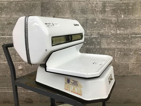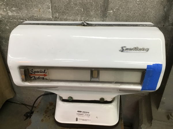 A staple of the old-timey deli counter, here we have a vintage grocery scale from Sanitary Scale Co! Looks to be from the 1940s, and the porcelain is in great condition for it's' age. Could use a clean up! It looks to read accurately, and the internal light worked when tested in our receiving department.