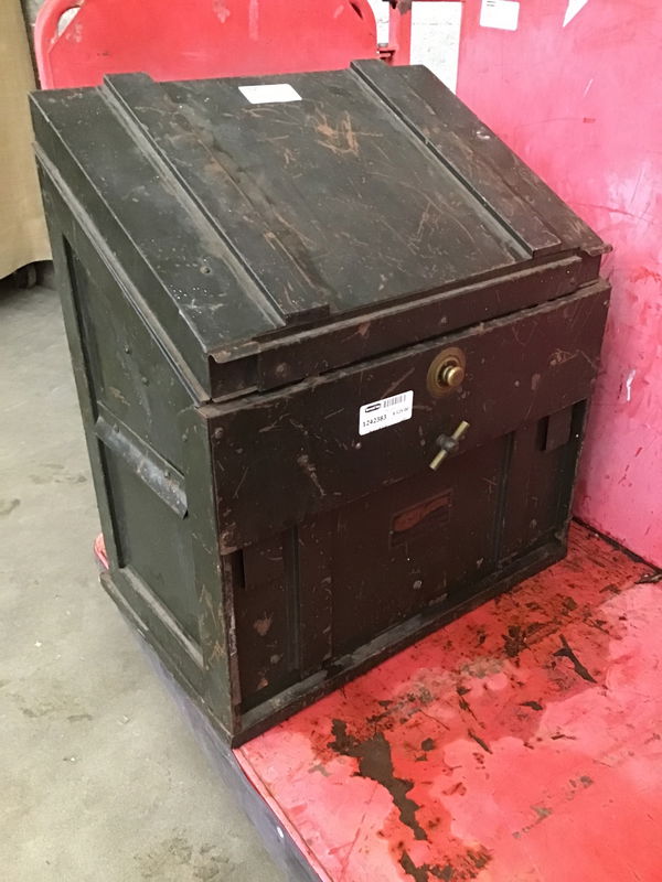 Heavy duty safe made by Protection Account Register Company in Detroit, MI. We're told it's from the 1940's era. The dial doesn't rotate and the safe doesn't lock, but it would still make for a great liquor cabinet.