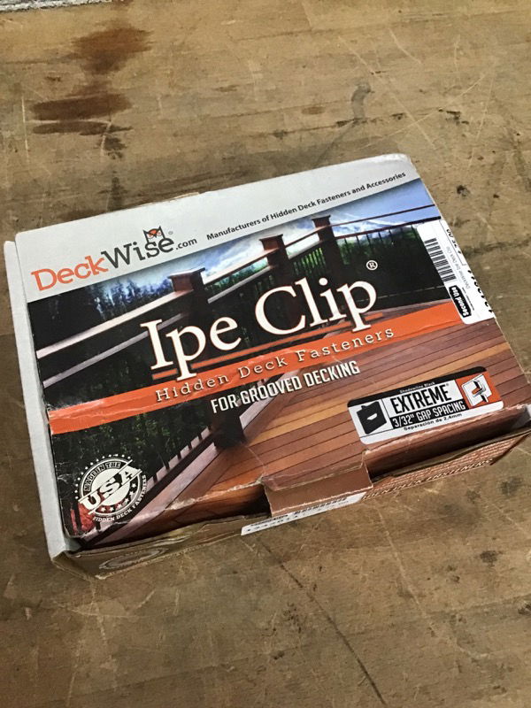 Brand new box of appx 175 Ipe Clip hidden deck fasteners (and stainless screws) for T-n-G decking, allows for a 3/32" spacing gap, covering about 100 square feet. Compatible with air-dried, kiln-dried and composite decking. The 'zons, gots 'em here