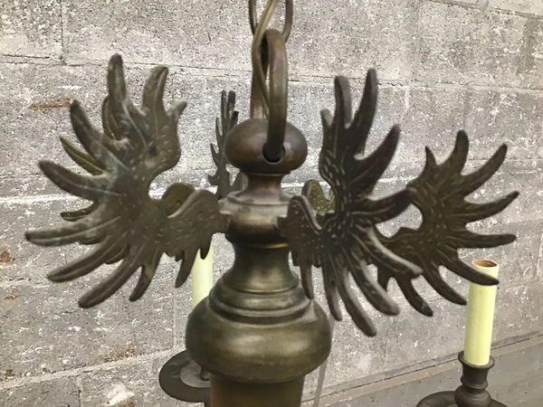 Really funky vintage solid brass 6-arm chandelier with unique geometric shape and 6 feathered wings evoking a humble, many-winged celestial being. Made by Chapman in 1974. One of the wings, which seem to be threaded but were at some point welded on, needs to be re-attached with some JB-Weld or actual soldering (currently has plumbing tape barely holding it in place).