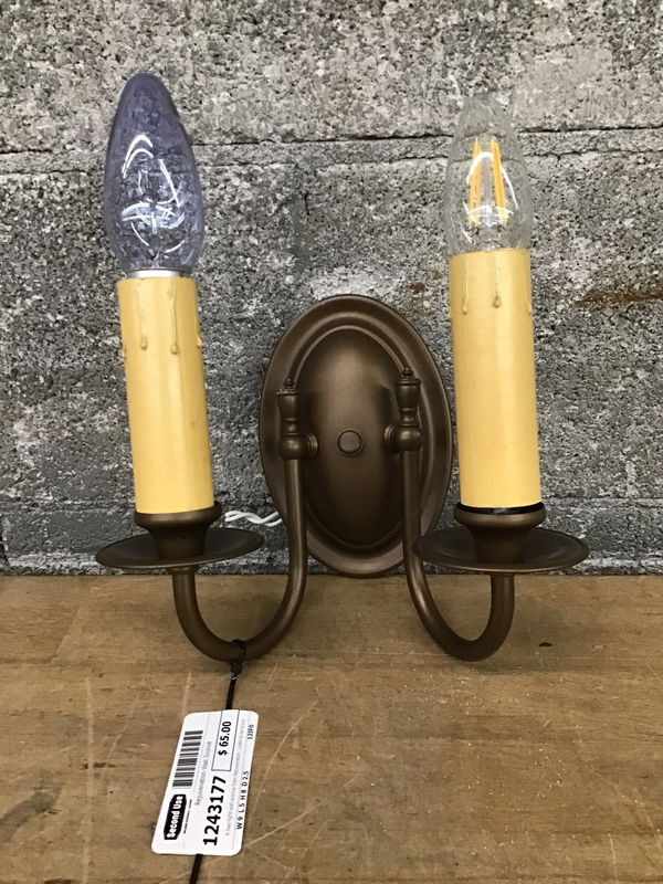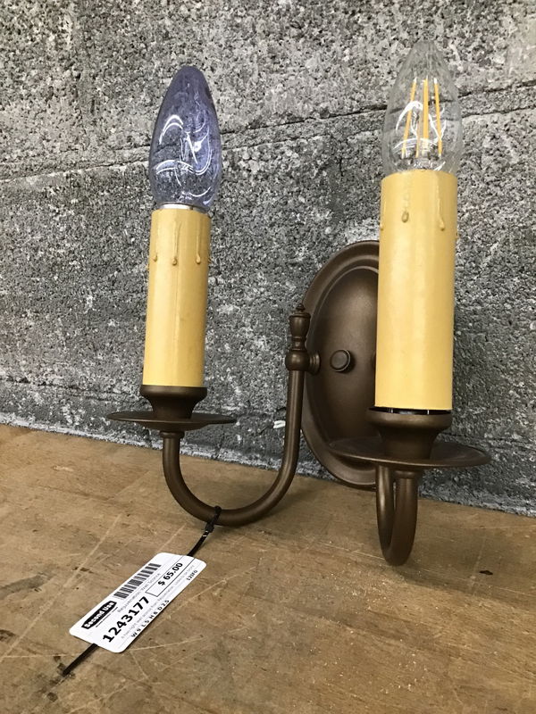 A two-light wall sconce from Rejuvenation. Looks to be bronze finished brass with wiring in good condition. A charming piece that wants to light up your living room or entry way.