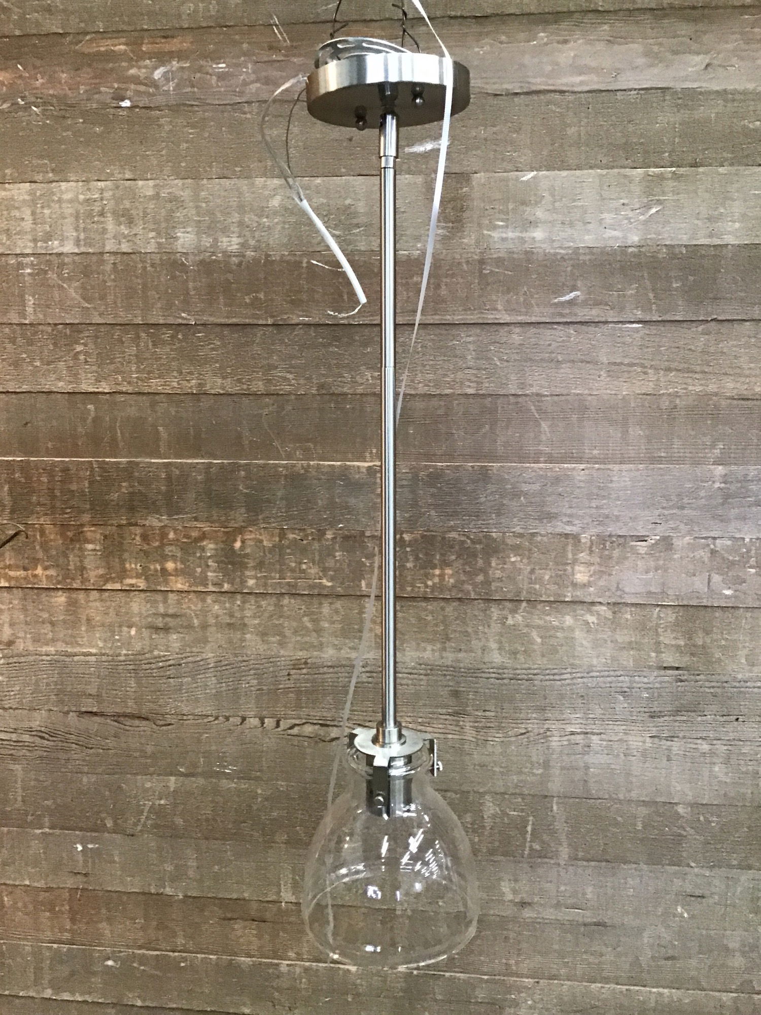 Clear glass shade mounted on a satin nickel finish. Assembled in house in like-new shape.