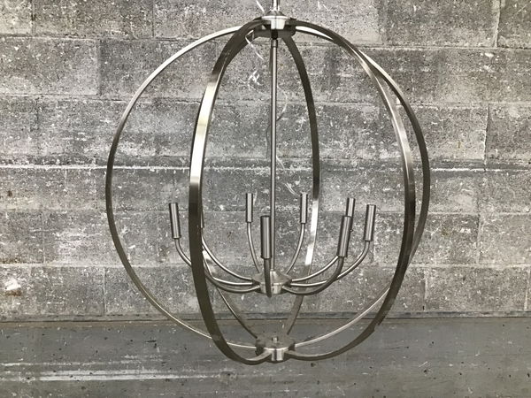 A nine-bulb chandelier by Golden Lighting, part of their Colson line, this chandelier features a cage-like construction in a spherical shape around the bulbs, with a stainless steel finish (though I think it's listed as "Pewter" on their website). Retails new for about $779.