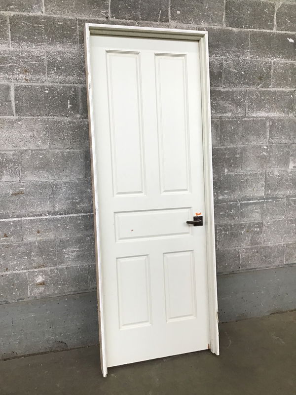 This five panel door is from a bathroom the handle on the outside is oil rubbed bronze and the handle on the inside is a pewter color.