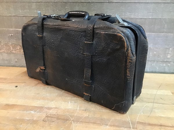 Vintage suitcase made out of thick cowhide. Looks like it could use a good conditioning as the leather seems dried at places but this would make a cool, solid carrying case after a wipe down with leather conditioner and some dye. This is also a good amount of thick leather if repurposing for material.