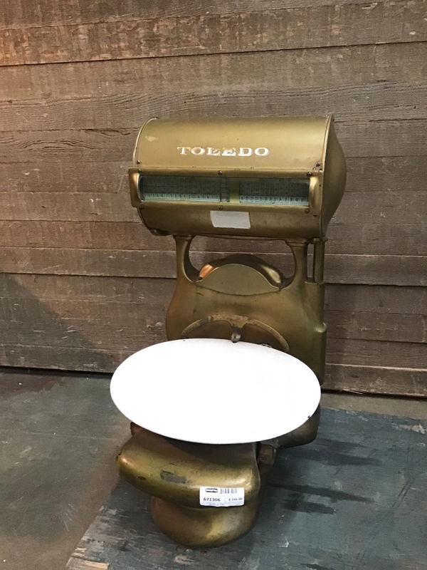 Vintage Toledo food scale in pretty good condition. Colored gold with a white cast iron plate. Dated 1961. All the glass looks to be in good shape. We don't know if it is accurate, but it could probably be calibrated if desired. This would make a great decor piece for collectors.
