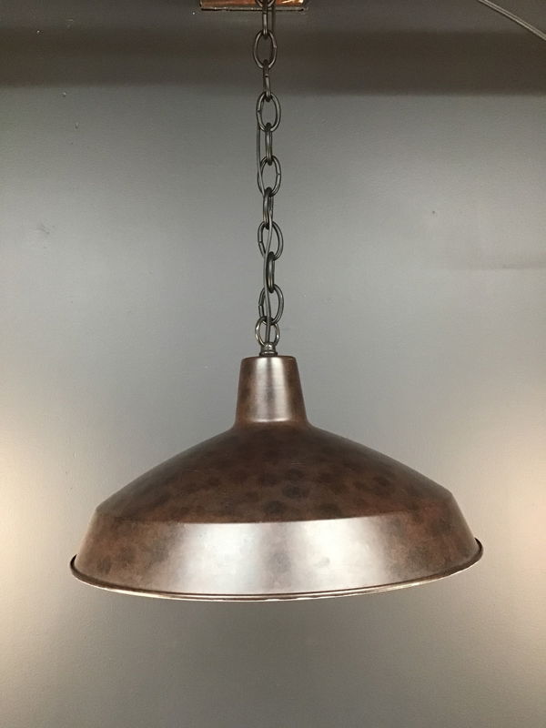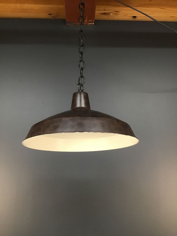 An aged bronze colored barn light hangs on 18" of black chain, with 14' of cord with a plug and inline switch. Built in our on site light repair workshop