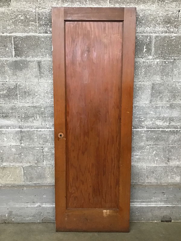 An oak single panel door with a stain that brings out the warmth of the wood's tones. Formerly set up for vintage hardware.