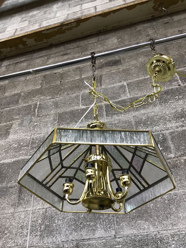 Brand new hanging light with dazzling opalescent and reed panes and bright brass finish, hanging from a 3' chain. Features 5 candle style lights and one single downlight. The perfect dining table light!