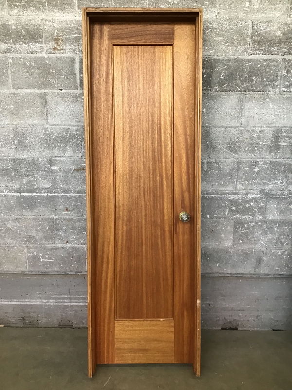 Beautiful! This prehung single panel solid core door has particularly thick oiled Mahogany veneer over fir construction. It has brass plated steel ball finial hinges and a Mahogany jamb, so you know this is a quality piece. Our wood expert believes that this door is made from either Honduran or Cuban mahogany, which are import controlled and commercially extinct in the United States.