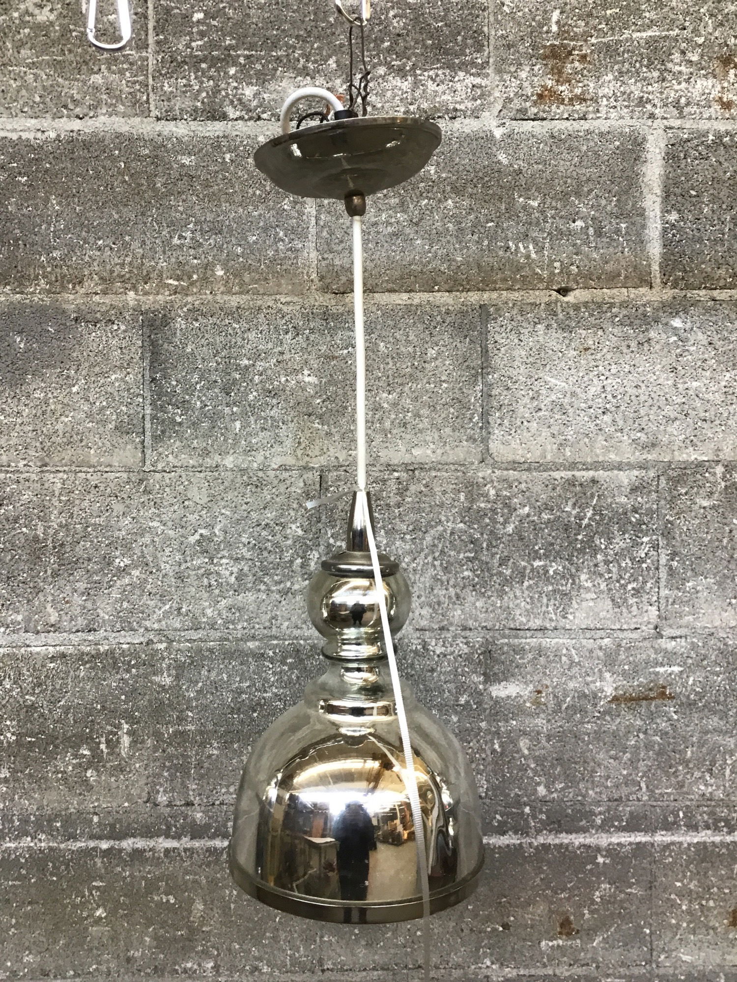 Polished nickel pendant light with modern industrial styling. The hanging height can be easily adjusted by lengthening or shortening the cord.