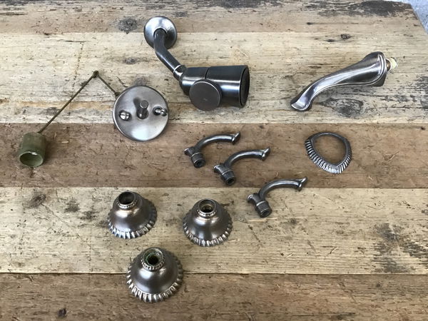 Beautiful high-end solid brass vintage bathtub faucet with an Art Nouveau style and brushed nickel finish. Comes with matching handles, diverter and showerhead. Appears to be a Sherle Wagner "Ribbon and Reed" design. An amazing salvage find!