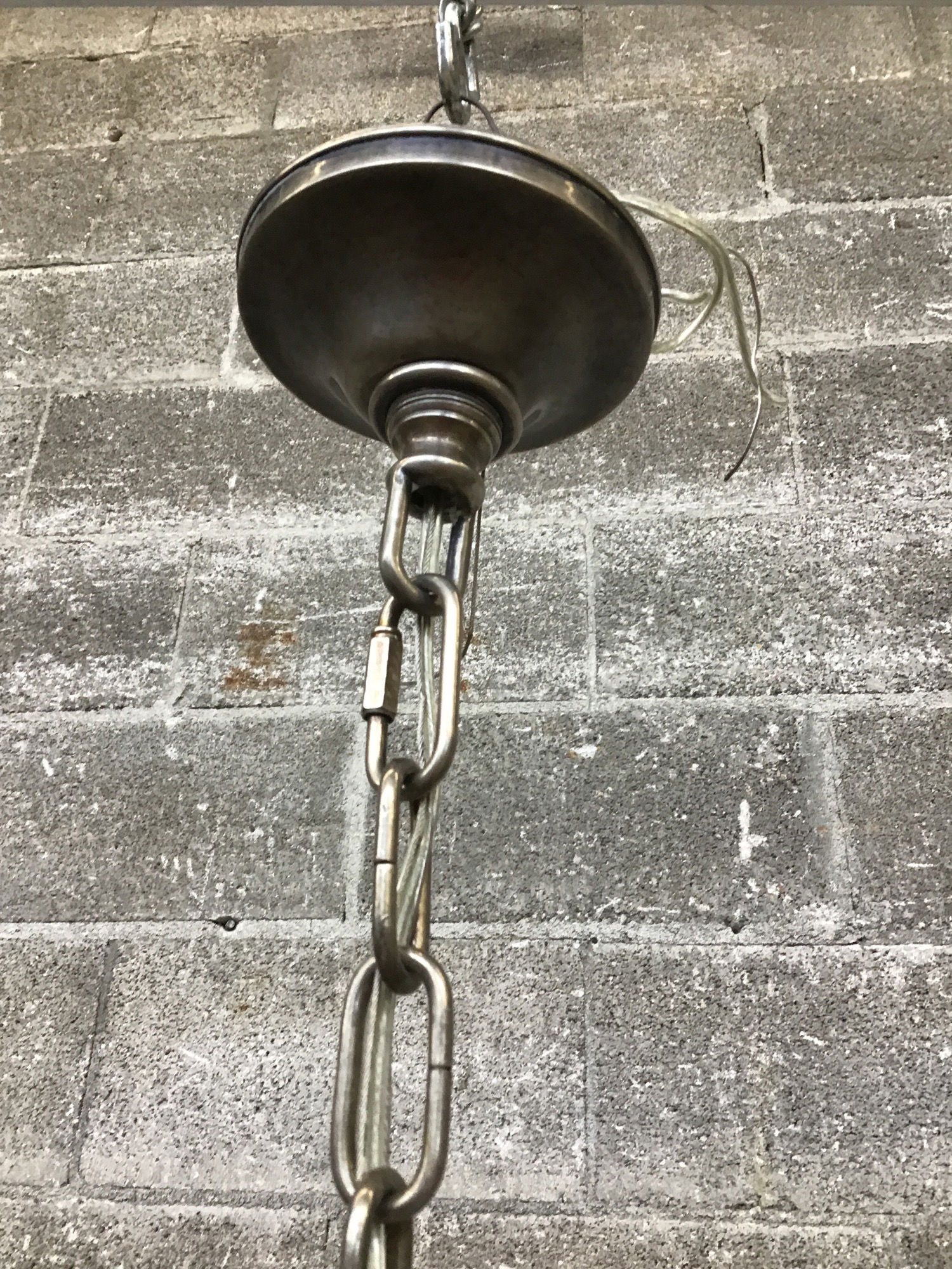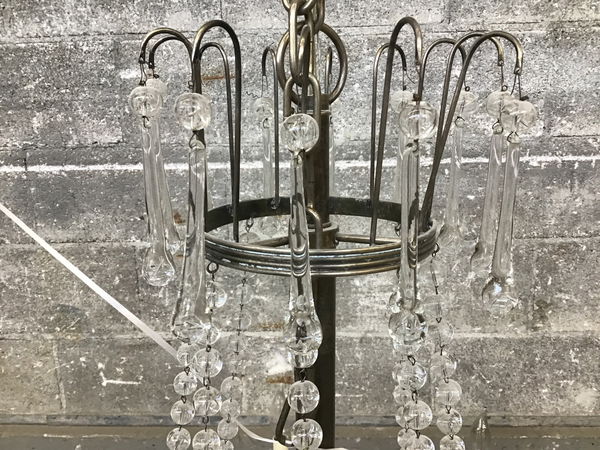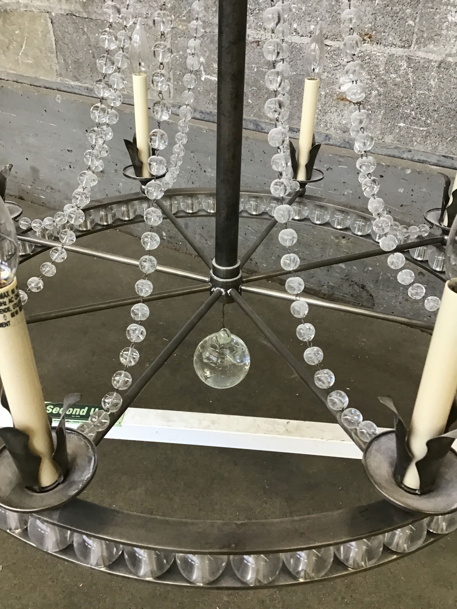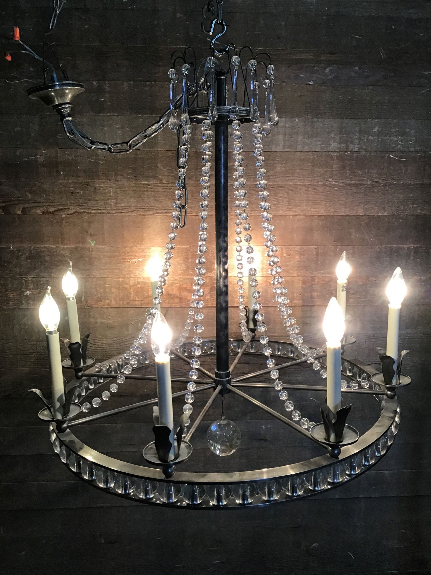 This large chandelier offers heavy metal construction, eight light sockets, candle-imitation sleeves, a rings of 1.5" glass globes, strings of 1/2" glass globes, leaf-like metal details and a halo of dangling glass drops. Limited wear from previous use.