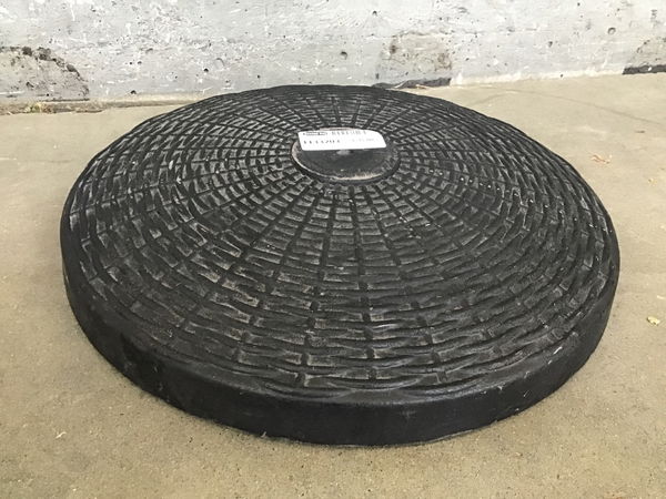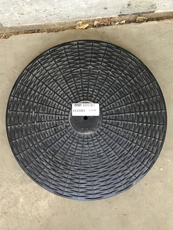 Cast black metal umbrella stand base with a woven basket looking design in good shape. Threaded hole in the center measures 0.5".