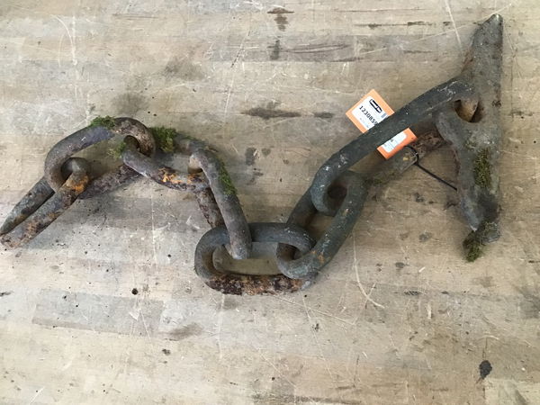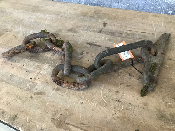 We have here a classic PNW boom log chain. It's a large heavy duty 40" length of chain with quite a bit of rust on it. Each link is 6" x 3.5" OD with a 7/8" thickness with one being 9.25" long.