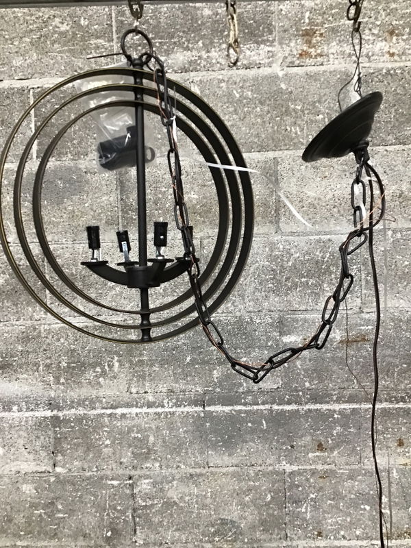 A pendant light fixture featuring an oil-rubbed bronze finish to its concentric ring construction that almost looks like an armillary sphere.