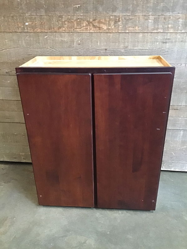 Kitchen upper cabinet in good, used condition. Built with a nice plywood box, with two doors, two adjustable shelves, and a nice dark stained Maple face. This was originally used in a home office and is very clean inside.