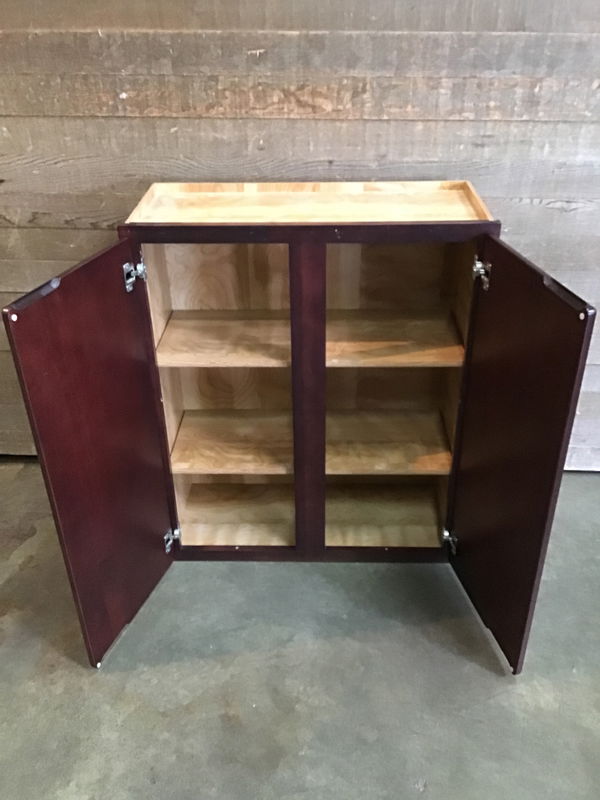 Kitchen upper cabinet in good, used condition. Built with a nice plywood box, with two doors, two adjustable shelves, and a nice dark stained Maple face. This was originally used in a home office and is very clean inside.