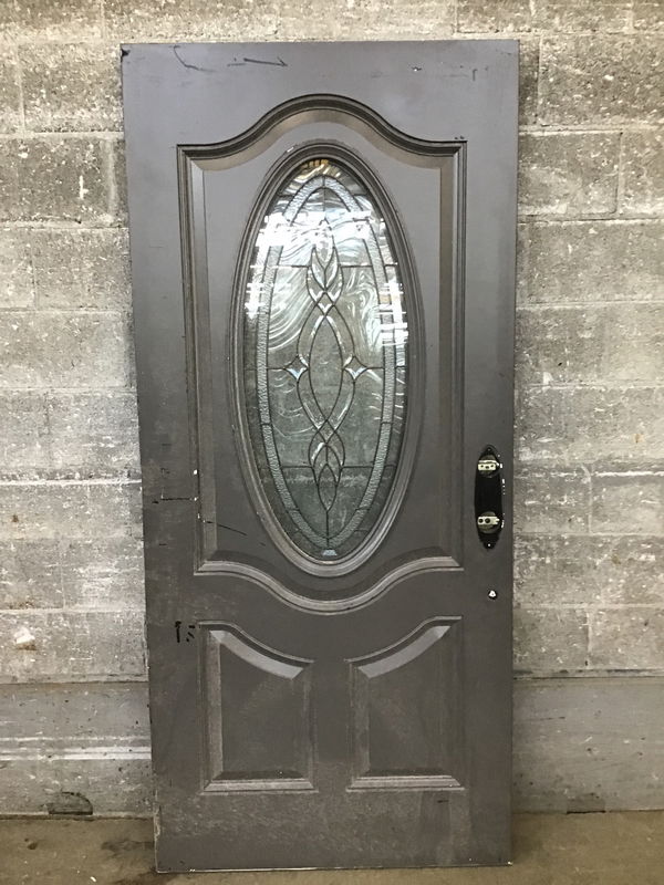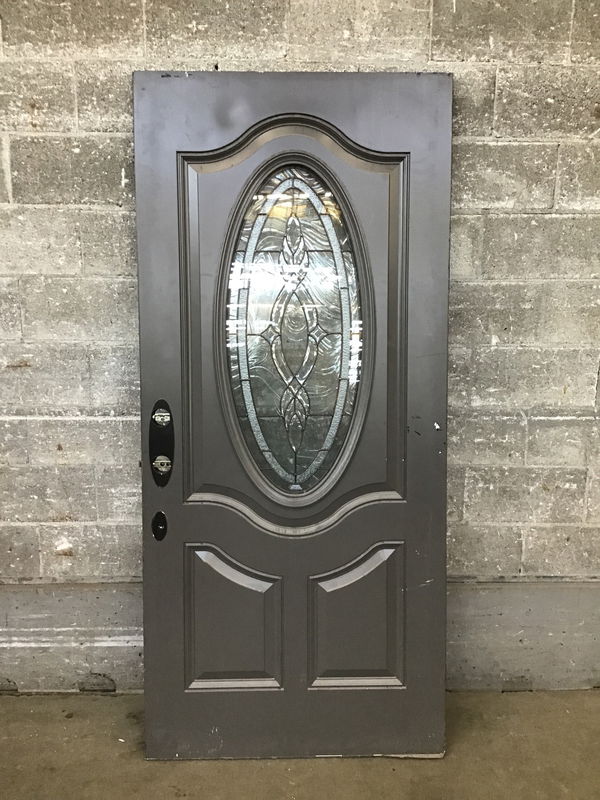LH Swing 36" Fiberglass entryway door with a center thermopane oval light featuring obscured lead divided glass. The door has been painted on both sides and both sides of a few scratches here and there. Overall solid door that includes hinges and a Baldwin latchset with key.