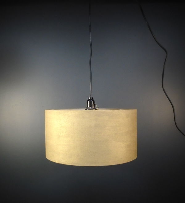 An 18" cloth shade that has been painted a subtly sparkly antique brass hangs from 15' of black plastic cord with a molded plug. The socket has a pull chain switch. Build in our on site light repair workshop. #RoyalHunter