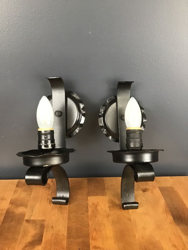 A pair of 1920s wrought iron Gothic Revival wall sconces. Restored in our on site light repair workshop