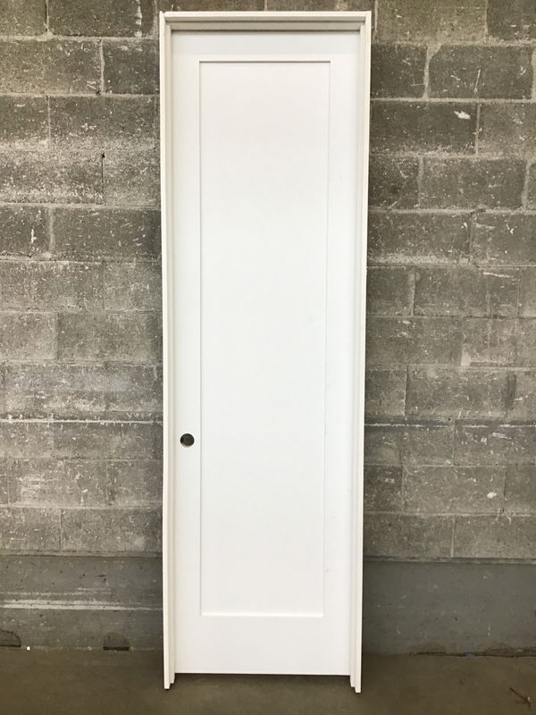 Primed masonite Shaker style one panel door in jamb for 2x4 wall.