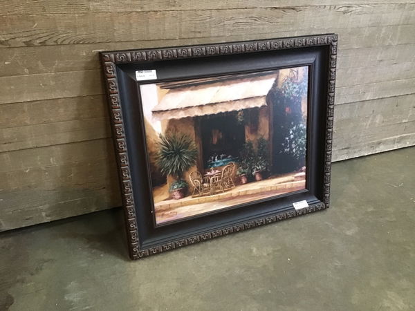 Great looking framed oil painting depicting outside a restaurant or cafe.