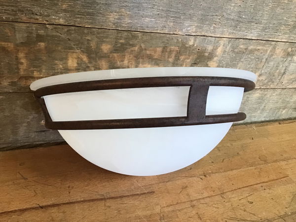 Bathroom wall sconce with a frosted half-bowl shade and a brown painted frame. Takes one standard bulb and is suitable for damp locations. Looks like this has never been installed.