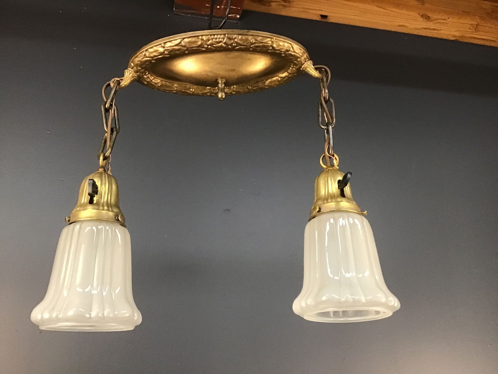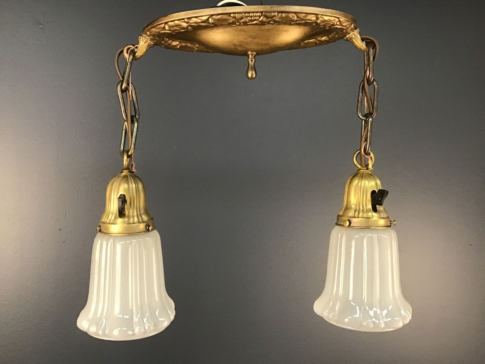 An antique double chain drop pan light with two Sheffield style shades. Circa 1915. Restored in our on site light repair workshop with new sockets with antique style paddle switch knobs, and brown rayon covered wire.