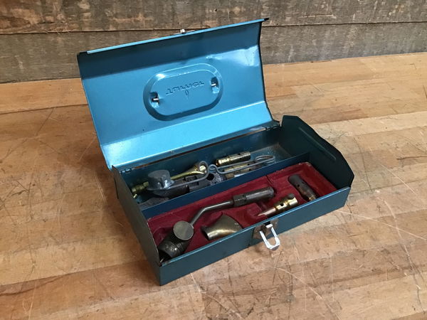 Has a sparker, a couple jeweler soldering tips, some wood impression tips, paint peeling and some other bits.