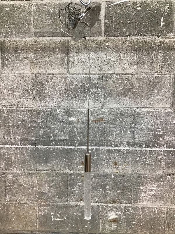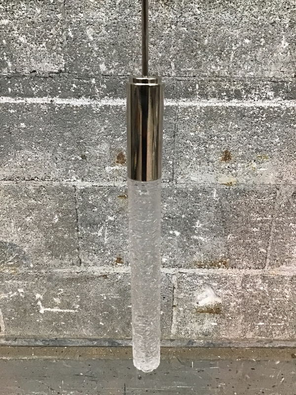 Slender modern pendant light with icey looking tube shaped glass portion and chrome fitter.