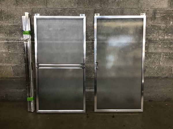 Chrome finished aluminum framed shower doors with obscure glass.