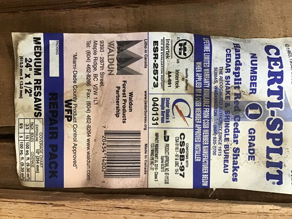 New, never installed pallet of #1 grade 24"x 1/2" handsplit red cedar shakes. These are 3/3 repair packs, 15 bundles in total, covering roughly 100sqft with a 10" exposure. These repair packs are 1/4 of a full bundle. A full 9/9 bundle retails locally for $198/bundle here