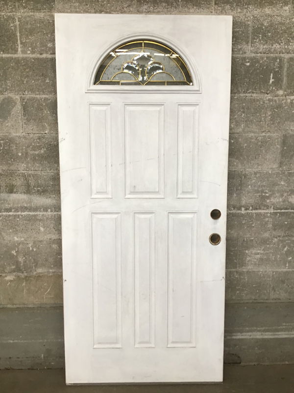 A vinyl-clad exterior entry door with a small lite up top with brassy leading and some obscured glass.