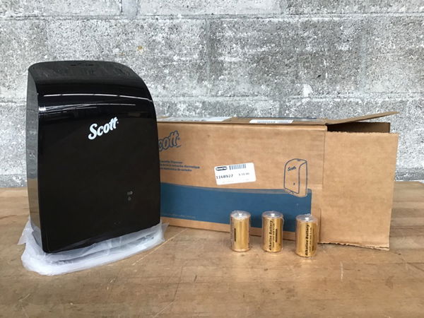 New in box, wall mount electronic touchless soap dispenser in black, includes 3 batteries.