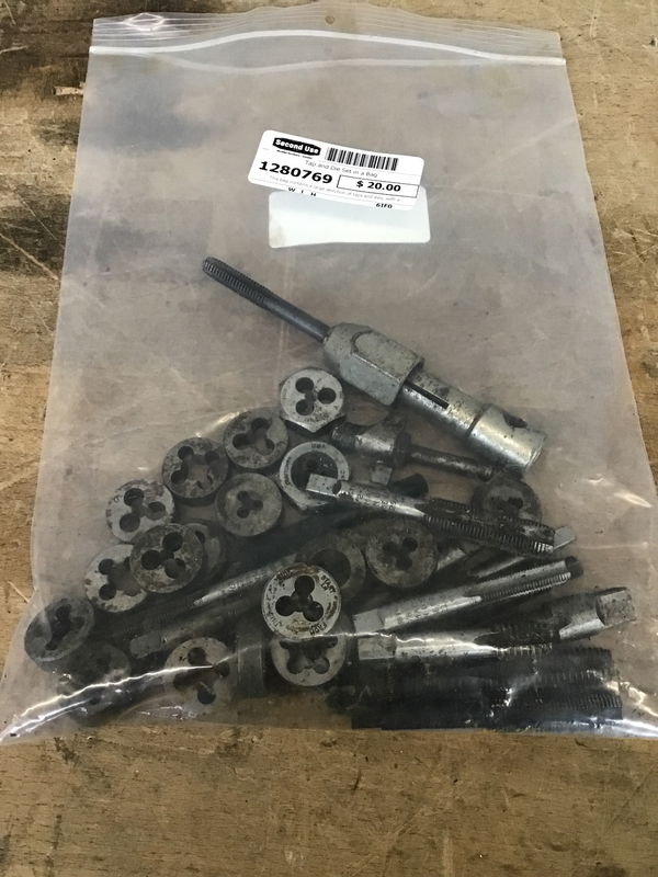 This bag contains a large selection of taps and dies, with a router bit thrown in. They're pretty filthy so we can't identify a lot but they seem to be in the range of #6 or #8 up to 1/2" or so. Can't tell if they're high speed steel or not. Take your chances and clean them up!