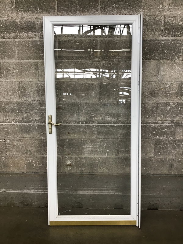 An aluminum screen door with a full-lite pane of glass, complete with flashing.