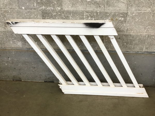Angled wood railing panel made of cedar that's been painted white. It's a little weathered from its previous life, but it's well built and made out of good wood, rife with repurposeability.