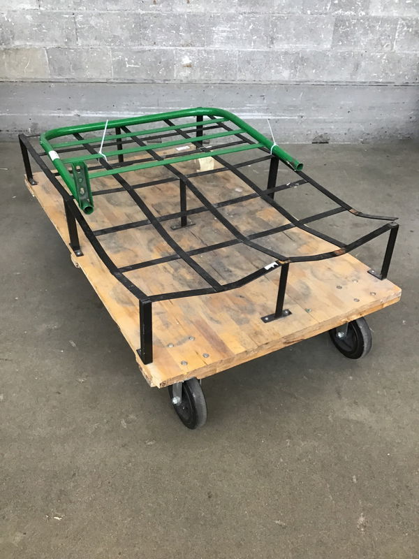 Capable work cart with really nice casters and wood deck with an odd steel cage like structure mounted on top; this can be easily removed. Handle is included but it either needs to be rewelded or jury rigged in some other way.